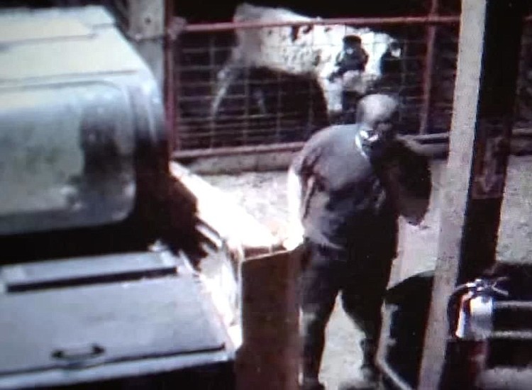 Surveillance video from the dairy farm shows a man walking inside the barn. At one point, he ducks behind a bale of hay, hiding from an employee.