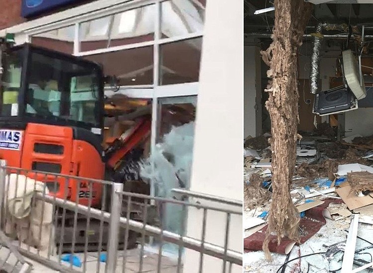 The driver then uses the digger bucket to smash fixtures inside the lobby, as another construction worker bangs on the side of the machine in what looks like an attempt to end the rampage.