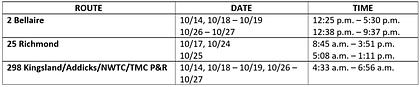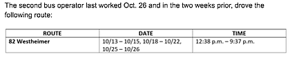 The first bus operator last worked Oct. 27 and in the two weeks prior, drove the following routes: