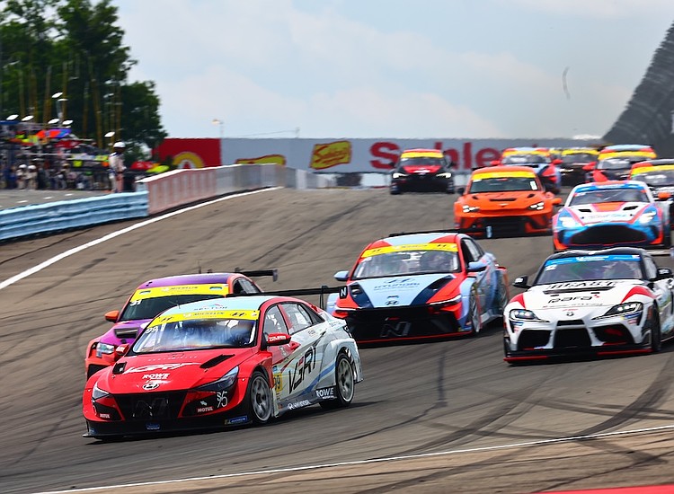No. 99 Hyundai Elantra N TCR drivers Tyler Gonzalez and Eric Powell are photographed on the podium after the LP Building Solutions 120 in Watkins Glen, NY, June 21, 2025. (Photo/Bryan Herta Autosport/Richard Prince Photography)Richard Prince.richard@rprincephoto.com
