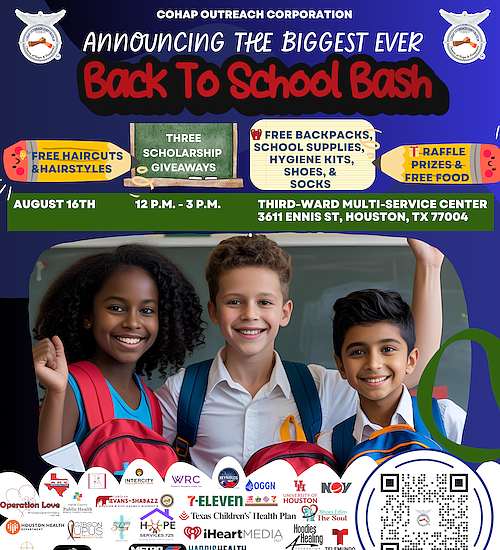 COHAP Outreach Corporation will once again host Houston’s largest annual Back to School Bash, set to take place on Saturday, August 16, from 12 p.m. to 3 p.m. at the Third Ward Multi-Service Center, located at 3611 Ennis Street. The free community event is designed to support underserved youth and military families as they prepare for a new academic year.