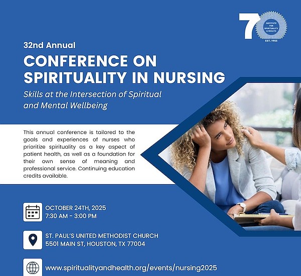 The Institute for Spirituality and Health at the Texas Medical Center will host the 32nd Annual Spirituality in Nursing Conference (SiNC) on October 24, 2025, at St. Paul’s United Methodist Church in Houston. Early Bird registration is available through September 30.