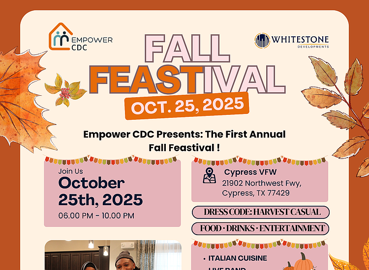 Empower Community Development Corporation (Empower CDC), a 501(c)(3) nonprofit organization, is proud to announce its First Annual Fall Feastival taking place Saturday, October 25, 2025, from 6:00 PM – 10:00 PM at Cypress VFW, 21902 Northwest Fwy, Cypress, TX 77429.