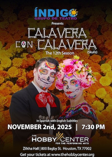 Teatro Índigo will celebrate a major milestone this fall as it presents the 12th season of its acclaimed Day of the Dead production, Calavera con Calavera (“Skulls”), on November 2 at 7:30 p.m. at The Hobby Center. The all-Spanish play, featuring English subtitles, continues its remarkable legacy as the first local theater production created by Latino immigrant artists to run for 12 consecutive seasons in the Houston area.