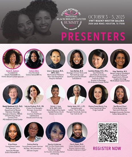 Sisters Network® Inc., the nation’s leading Black-led national breast cancer survivorship organization, will host the 2025 National Black Breast Cancer Summit October 3–5, 2025, at the Hyatt Regency-Galleria, 2626 Sage Rd., Houston, Texas.
