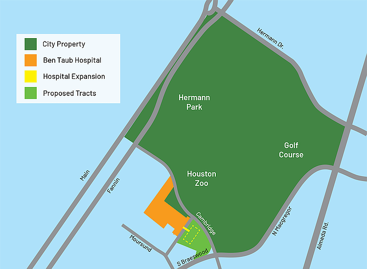 The expansion plan involves the acquisition of 8.9 acres of land adjacent to Hermann Park, separated by Cambridge Street. This action falls under provisions of the Texas Parks and Wildlife Code (Chapter 26) and the Texas Health and Safety Code (Section 281.050).