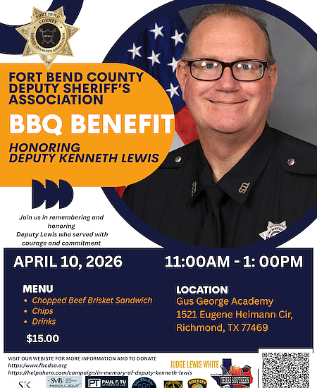 The Fort Bend County Deputy Sheriff’s Association is hosting a BBQ fundraiser in honor of Deputy Kenneth Lewis, with all proceeds benefiting his family.