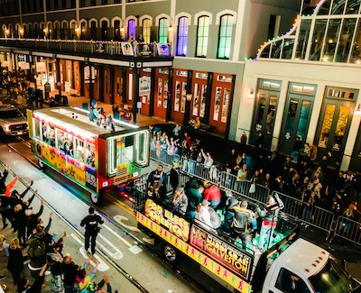 The weekend’s entertainment blends Texas country, funk, jazz, Latin music, and high-energy EDM. Highlights include block parties at the historic Tremont House, late-night dance experiences at Electric Mardi Gras!, and even a street circus, keeping revelers moving well into the night.