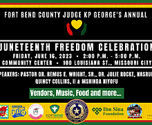 Fort Bend County Judge KP George will host his Annual Fort Bend County Juneteenth Celebration on Friday, June 16, 2023, from 2:00 p.m. to 5:00 p.m. at the Landmark Community Center, located at 100 Louisiana St., Missouri City, TX 77469.