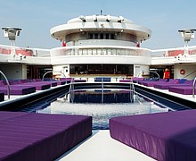 When you step into the Scarlet Lady cruise ship, you know immediately you're on Richard Branson's ship. There's a record store on the left selling limited edition Sex Pistols and Lady Gaga on vinyl. The crew has cooler outfits than …