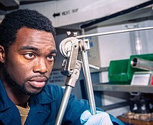 Aviation Structural Mechanic Airman Elijah Crowder, from Houston, bends aircraft hydraulic lines in the aviation hydraulics and pneumatics