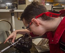 Machinery Repairman Fireman Kyle Martin, from Houston, verifies the thread pitch of threads manufactured in the machine shop aboard the U.S. Navy’s only forward-deployed aircraft carrier,