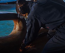 Seaman Allen Amarion, from Houston, sands the deck of the Nimitz-class aircraft carrier USS Harry S. Truman (CVN 75), November 28, 2022. T