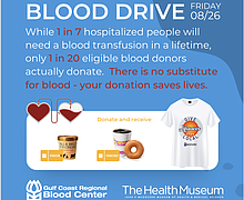 The Health Museum in partnership with the Gulf Coast Regional Blood Center will hold a Community Blood Drive. The blood drive will take place on Friday, August 26, 2022, from 9:00 am to 1:30 pm, at The Health Museum – …