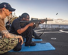 Ensign Tristan Edwards, from Houston, right, shoots an M4 rifle, and Gunner’s Mate 3rd Class Jakob Morgan, from Rossville, Ga., stands by as a line coach during a live-fire gunnery exercise on the flight deck of the Arleigh Burke-class guided-missile …
