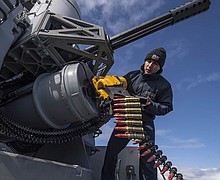 Fire Controlman 1st Class Alexander Perez, from Houston, reloads a phalanx close-in weapons system aboard the Arleigh Burke-class guided-missile destroyer USS Carney (DDG 64) during Formidable Shield 19, May 11, 2019.