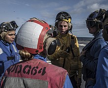 Boatswain’s Mate Seaman Chance Vaughan, from Houston, Texas, gives a brief to the flight deck crew before flight operations aboard the Arleigh Burke-class guided-missile destroyer USS Carney (DDG 64) during Formidable Shield 19, May 12, 2019. Formidable Shield is designed …
