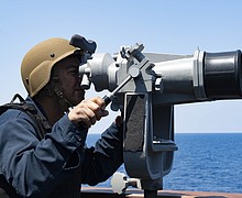 Culinary Specialist 1st Class Samuel Villarreal, from Houston, Texas, uses binoculars while standing watch during a combat systems drill aboard the Arleigh Burke-class guided-missile destroyer USS Mason (DDG 87).