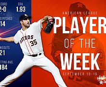 Major League Baseball announced this afternoon that Houston Astros right-handed pitcher Justin Verlander has been named the American League Player of the Week for the week of Sept. 10-16. This marks the eighth career American League Player of the Week …