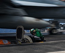 180918-N-OY799-0209 PHILIPPINE SEA (September 18, 2018) Aviation Boatswain's Mate (Equipment) Airman Kiara Webb, from Houston, crouches down as an aircraft launches from the flight deck of the Navy’s forward-deployed aircraft carrier USS Ronald Reagan (CVN 76) during Valiant Shield 2018.