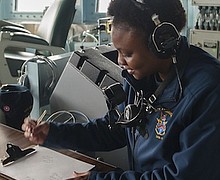 ARABIAN GULF (Dec. 8, 2017) Operations Specialist 2nd Class Trascion Stokes, a Houston native, assigned to the operations department aboard the amphibious assault ship USS America (LHA 6), records surface contacts on the bridge.