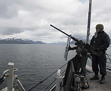 Fire Controlman 2nd Class Luis Moreno, from Houston, mans a .50-caliber machine gun aboard the Arleigh Burke-class guided-missile destroyer USS Ross (DDG 71) as the ship transits the Norwegian Sea June 29, 2017.