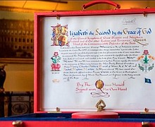 An image of Queen Elizabeth II's elaborate notice of consent to the marriage of Prince Harry and Meghan Markle was released Saturday.