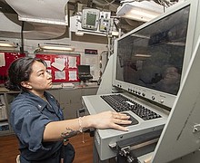 Gas Turbine System Technician (Electrical) 2nd Class Carina Valle, from Houston, operates an integrated computer assessment system during maintenance aboard the guided-missile destroyer USS Forrest Sherman (DDG 98).