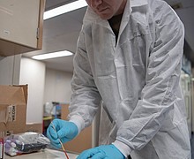 Hospital Corpsman 2nd Class Jesús Montes, from Houston, places a blood sample on a test slide for microscopic staining aboard Military Sealift Command hospital ship USNS Mercy (T-AH 19) March 26. Mercy deployed in support of the nation’s COVID-19 response …