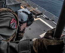 Houston Sailor assists in landing a helicopter on flight deck of Navy ship