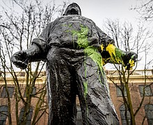 It takes less than a minute to walk from Amsterdam's beautiful Portuguese Synagogue to the "De Dokwerker" statue.
