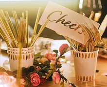 Flower crowns. Metallic-colored balloon banners. Glitter candles. Paper straws, plates and napkins with gold brush strokes.