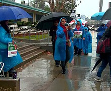 Under a relentless drizzle of cold rain, 32,000 Los Angeles educators walked off the job Monday in the country's second-biggest school district.
