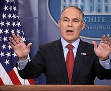 As questions swirled over whether or not he can hold onto his administration post, embattled Environmental Protection Agency Administrator Scott Pruitt appeared calm on Tuesday as he touted the agency's decision to revise greenhouse gas emissions standards for automobiles.