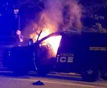 Georgia Tech's campus didn't bear any scars Tuesday from a violent night that left a police vehicle torched and three people, at least one of them a student, in handcuffs.