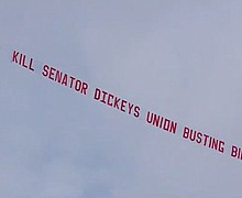 Opponents 'union busting bill' fly message above Iowa Statehouse