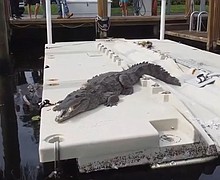 A comfy crocodile that was found on a dock is staying put for the time being.