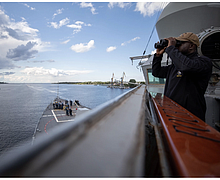 230809-N-QI593-1303 RIGA, Latvia (Aug. 9, 2023) Logistics Specialist 3rd Class Raymond Akintunde, from La Marque, Texas, looks for surface vessels from the bridge of the Arleigh Burke-class guided-missile destroyer USS Roosevelt (DDG 80) as the ship departs Riga, Latvia, Aug. …