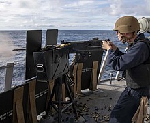 Mineman Seaman Zachary Obert, from Houston, fires an M-2 HB 50 caliber machine gun during a live-fire exercise aboard Independence-variant littoral combat ship USS Charleston (LCS 18) in the South China Sea, Jan. 26.