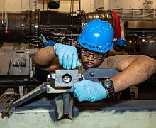 Machinery Repairman Fireman Kyle Martin, from Houston, verifies the thread pitch of threads manufactured in the machine shop aboard the U.S. Navy’s only forward-deployed aircraft carrier,
