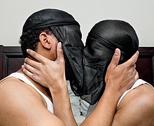 As D'Angelo Lovell Williams posed for a kiss with a former partner, Glenn, in front of the camera, their faces each obscured by the black silk cloth of a backwards durag, the photographer had a famous painting in mind.