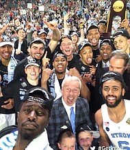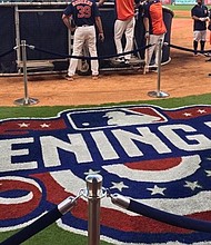 Houston Astros center fielder George Springer (4) celebrates with third base coach Gary Pettis (8) after hitting a home run during the first inning against … Published on April 4, 2017 |