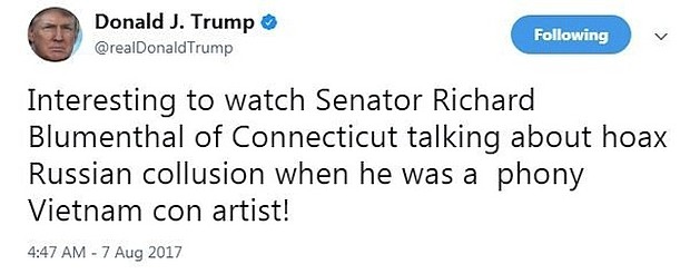 Connecticut Sen. Richard Blumenthal called President Donald Trump out on Twitter for "bullying" after a Twitter attack from the President accused the senator of lying and being a "phony Vietnam con artist."
