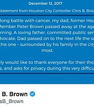 Photo provided by Chris Brown via Sylvester Turner Twitter feed (@SylvesterTurner) Former Houston City Council Member Peter Brown died on December 12, 2017, at the … Published on December 12, 2017 |