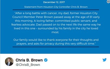 Former Houston City Council member Peter Brown died Tuesday at the age of 81, his family announced.