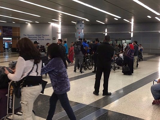 At Bush Airport, families waited Monday afternoon for relatives to arrive from overseas. It could take hours for them to clear customs, even though some of them have green cards.