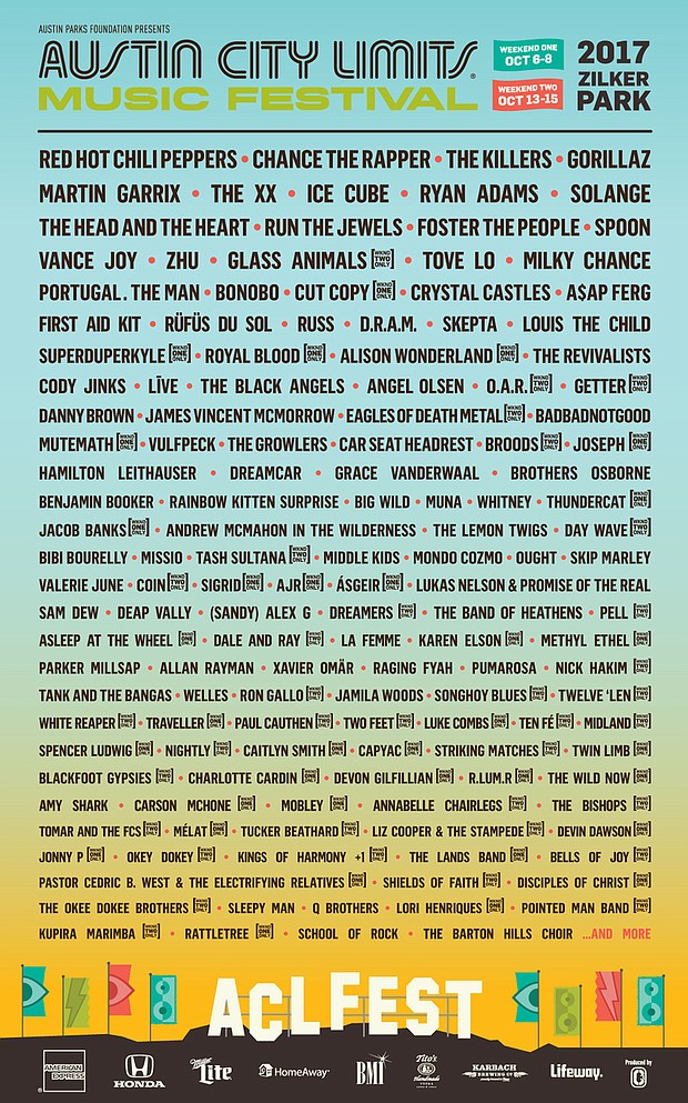 Red Hot Chili Peppers, Chance The Rapper, The Killers, Gorillaz, Martin Garrix, and The xx are set to headline this year’s massive Austin City Limits Music Festival lineup. ICE CUBE, Ryan Adams, Solange, The Head and the Heart, Run The Jewels, FOSTER THE PEOPLE, Spoon, Vance Joy, ZHU and more will deliver an incredibly diverse musical landscape throughout ACL Fest’s epic two consecutive weekends. The world-class festival will deliver more than 140 bands across eight stages at Zilker Park, October 6-8 and October 13-15.