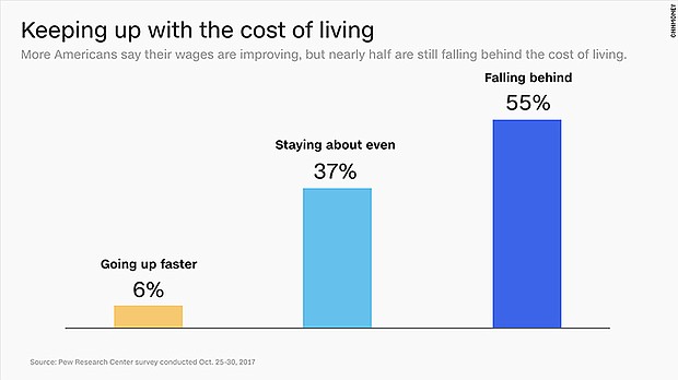 If you ask most Americans, finding work isn't that difficult these days. But getting paid enough to get by still remains a problem. The percentage of residents who think jobs in their area are plentiful spiked to 50% last month, the highest reading since the Pew Research Center began asking the question 16 years ago. Those perceptions match reality. In October, the unemployment rate also reached its lowest rate since 2001, and the number of people working part-time because they can't find full-time jobs is back to its pre-recession level.