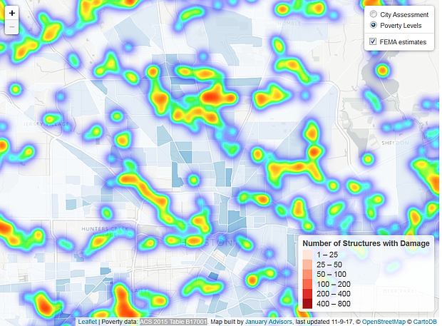 The latest addition to the city's "Harvey By The Numbers" online project is a map showing FEMA data on the severest flooding in Houston and beyond from Hurricane Harvey, combined with income level data for each U.S. Census tract.