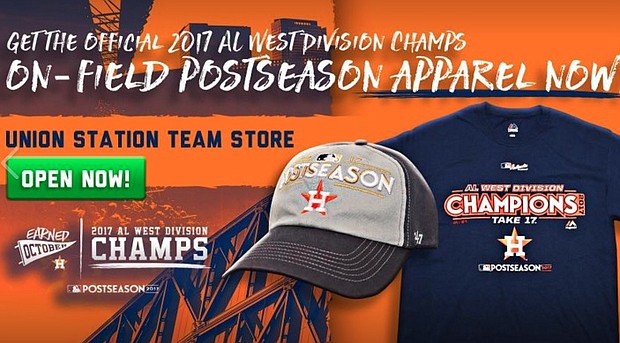 With today’s win, the Astros officially clinched their first division title since 2001 and kicked off the Astros Team Store Postseason Clinch Event. The Postseason Clinch Event is open now at the Union Station Team Store and will remain open to the public for 24 hours. This special retail event is the very first opportunity for Astros fans to purchase their 2017 Astros Postseason merchandise.